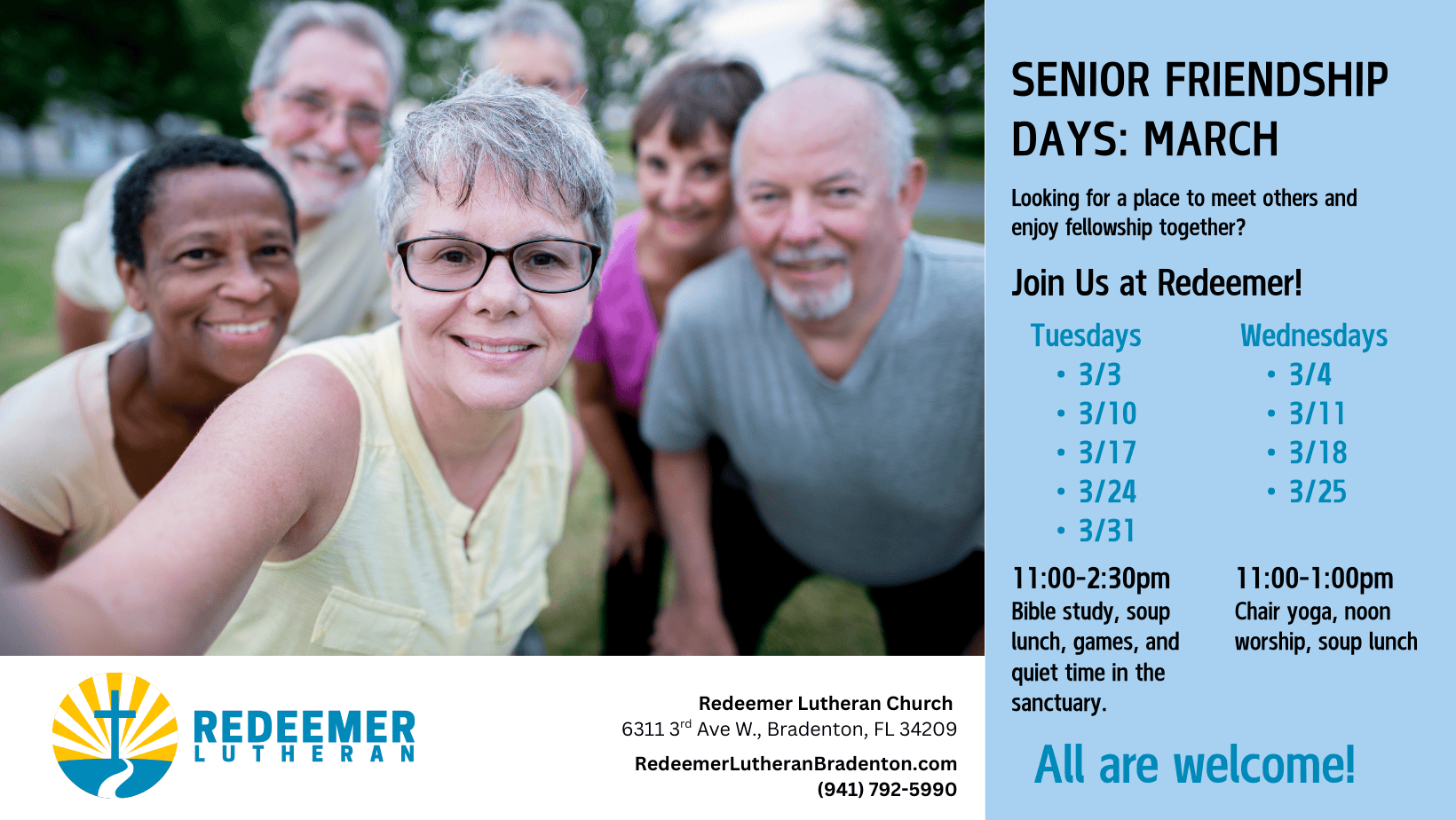 Redeemer Lutheran Church invites seniors in Bradenton to enjoy our Senior Friendship Days - a time when you can connect with others, enjoy a meal together, learn something new, and refresh your spirit. Come for the whole time or drop in between 11am-2:30 pm.